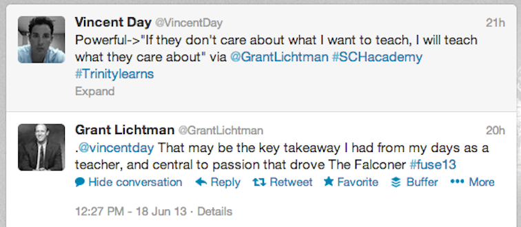 1. Let’s interact! Incredible conversation going on at #Fuse13 in Atlanta today…and it is almost ALL about issues in the first few chapters of The Falconer. I never knew back then that there would be this thing called “design thinking” that is rooted in the simple concepts of questioning and problem finding.